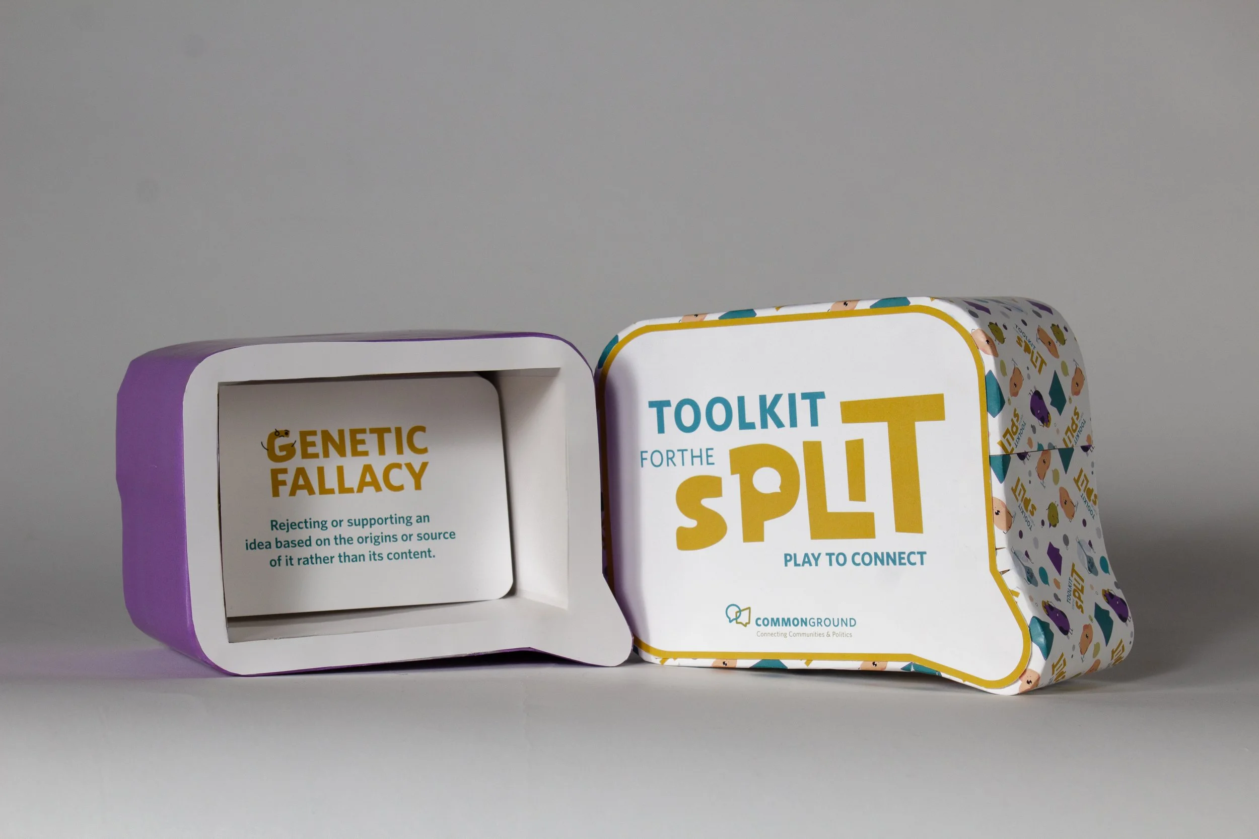 The Toolkit for the Split was a collaborative project designed for Common Ground Politics to make learning about political fallacies engaging and interactive. We developed a “Heads Up”-style card game that teaches key political concepts in a fun, approachable way. In addition, we created a new brand logo and packaging for the toolkit, ensuring it aligned with the existing Common Ground Politics brand identity and website aesthetics. The project combined educational design with playful, user-centered branding.