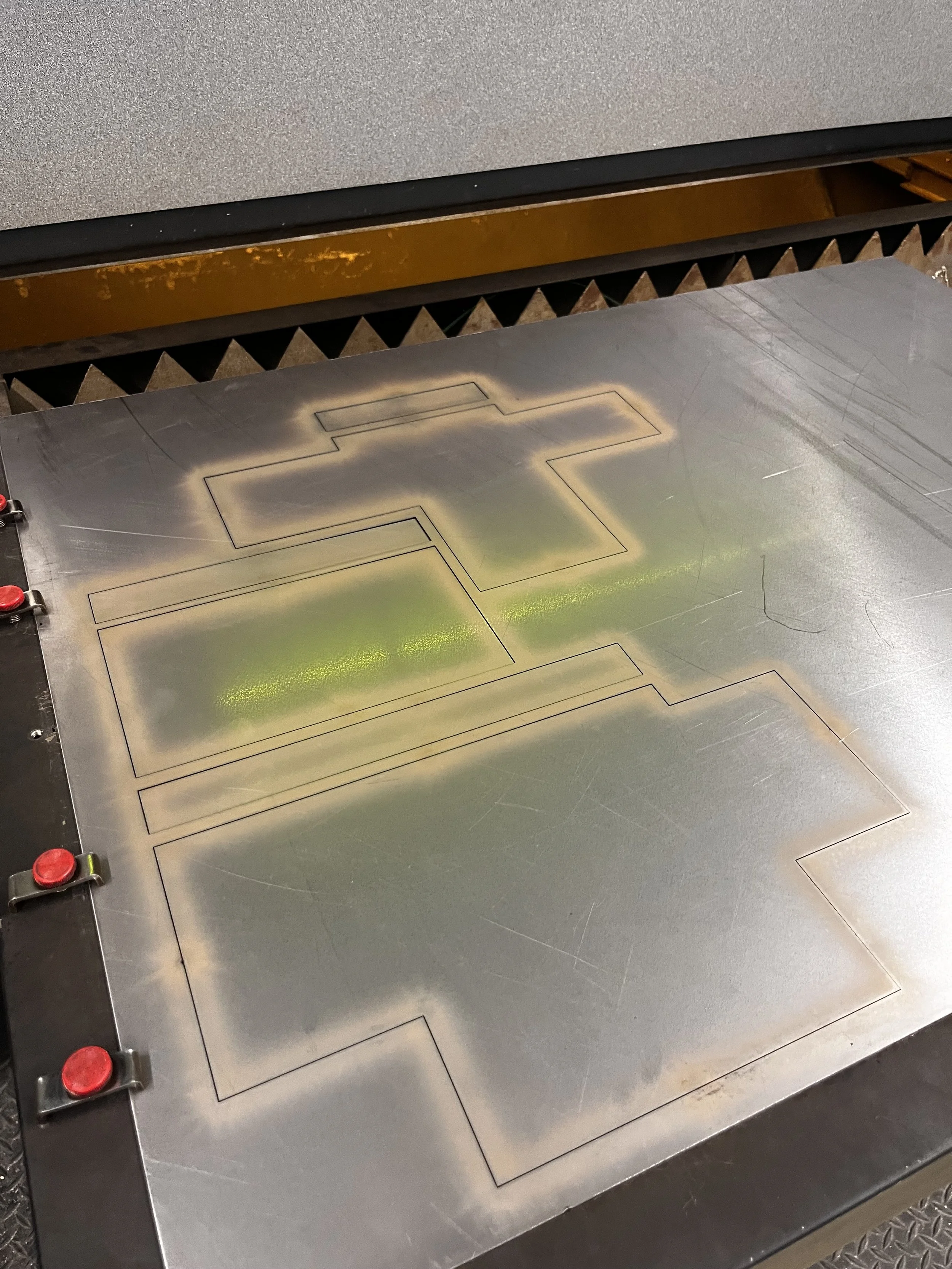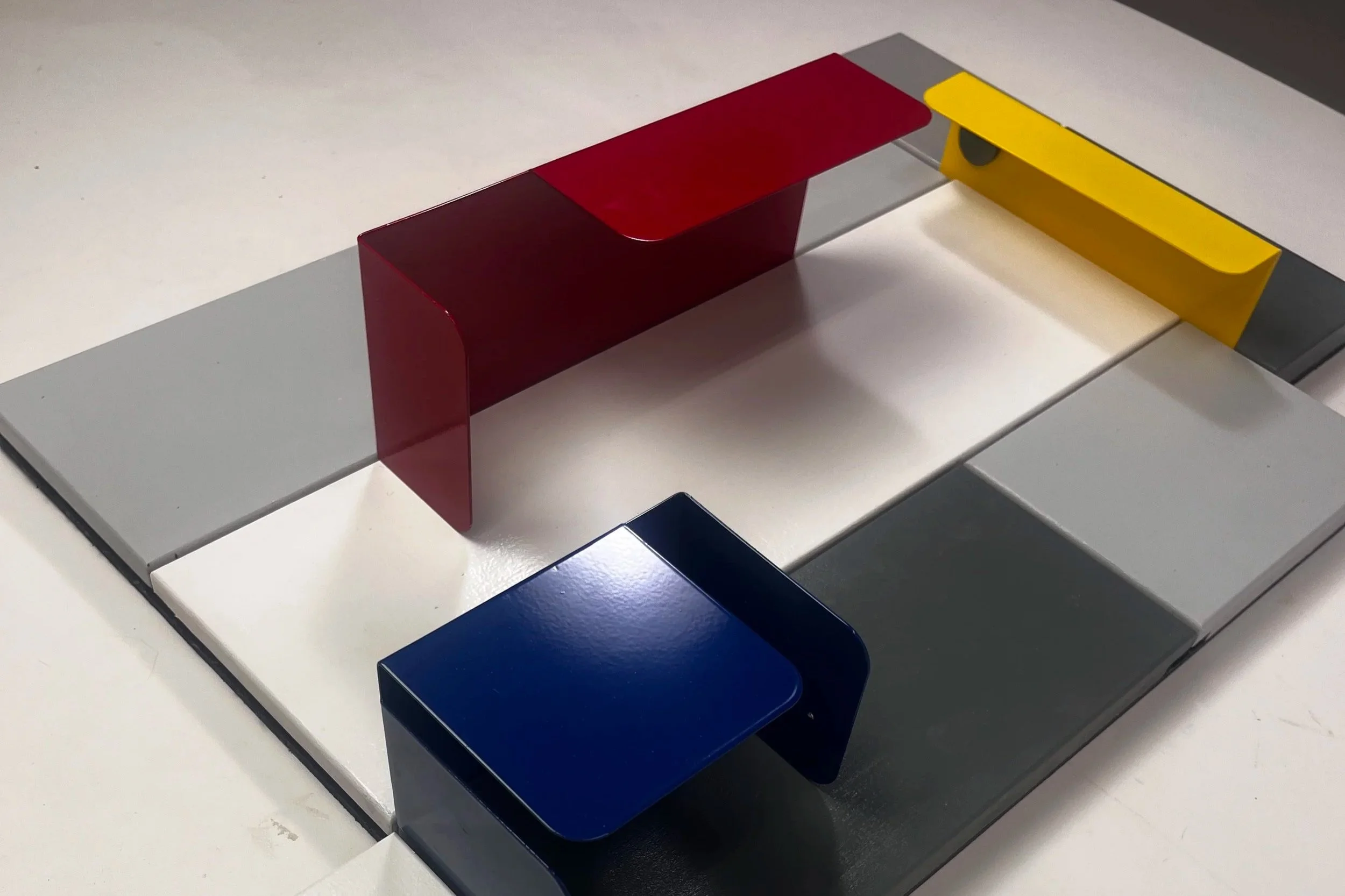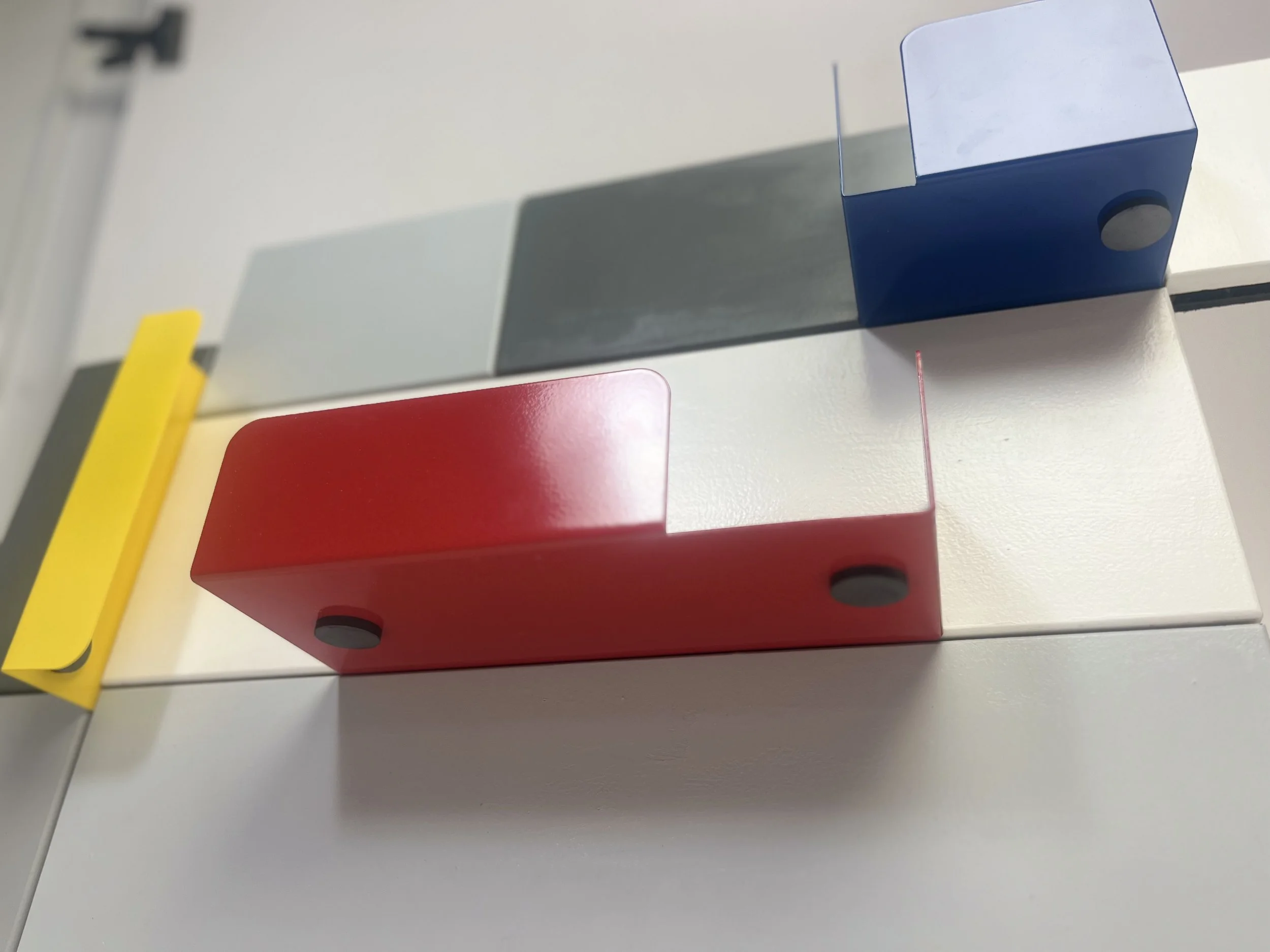 For my furniture class at the University of Alberta, I designed and built a shelf inspired by the Rietveld Schröder House and the De Stijl movement. I was drawn to De Stijl’s philosophy of reducing visual complexity into pure geometric forms and primary colors, and I translated this into a modular shelving system that allows the user to actively engage with the composition. The back panel is MDF with routed tracks, while the shelves are made from 18-gauge steel, fiber laser cut and bent to slide in and out. The use of steel not only allows the shelves to be magnetic but also reinforces the movement’s emphasis on simplicity, functionality, and harmony between form and space. By combining architectural inspiration, geometric rigor, and interactive functionality, this piece embodies the principles of De Stijl while inviting the user to participate in the composition.