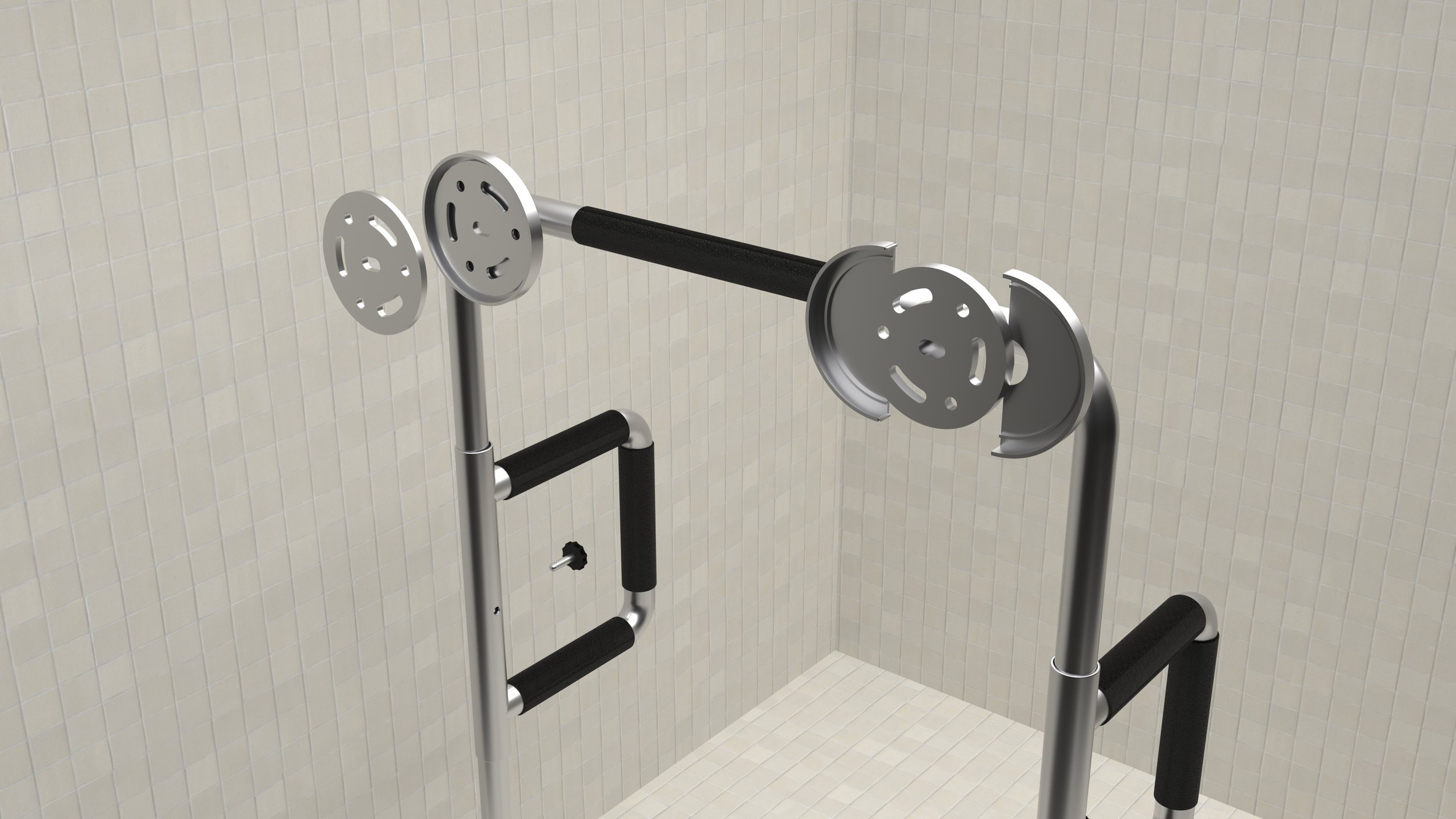 The 1000 millimetre tall structure provides a continuous path of support as users enter, move within, and exit the shower, positioning grip points within natural reach between control access and sit-to-stand height. The U-shaped frame distributes force across multiple anchor points for increased strength while remaining outside required shower clearance zones. Adjustable horizontal bars slide along vertical rails using a simple pin-based mechanism, and folding side handles provide adaptable lateral support across a range of users and care scenarios.