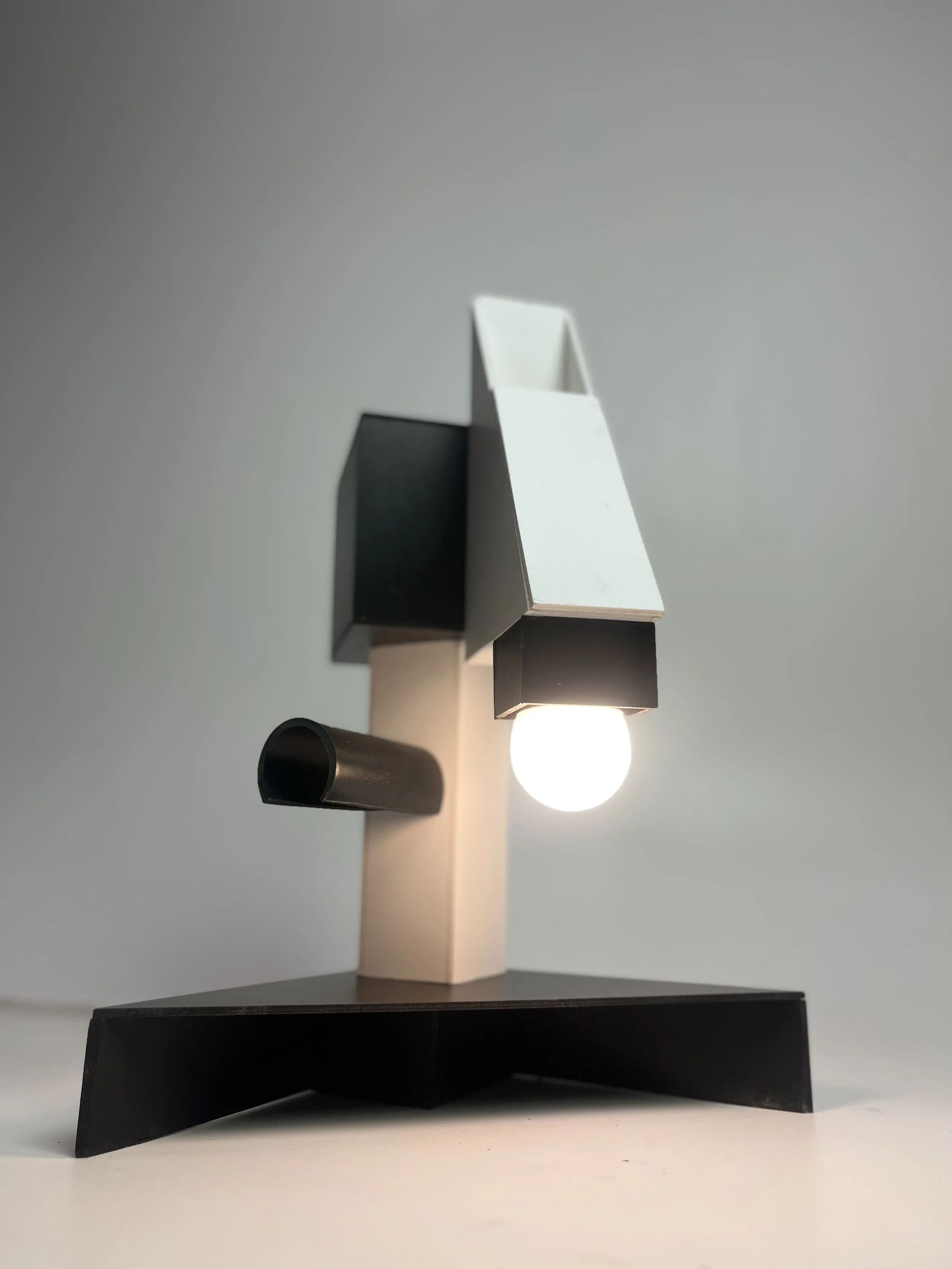 Drawing inspiration from the Memphis design movement, I created a lamp that embraces geometric abstraction and playful form. Memphis design is known for its rebellious take on traditional design—favoring expressive shapes and unconventional compositions. I echoed that spirit in my lamp's structure, treating the Sintra not just as a building material, but as a graphic element within the form itself.